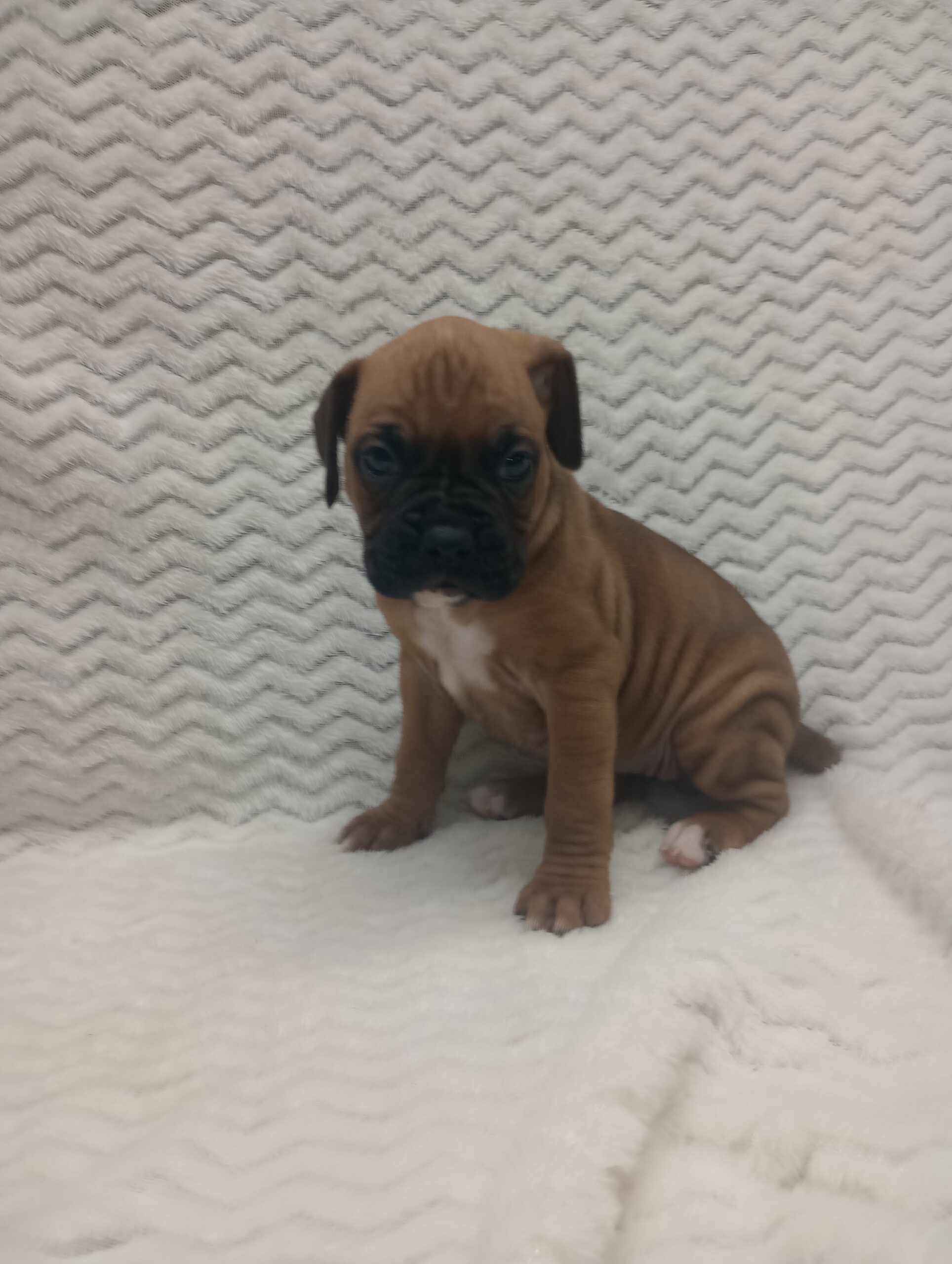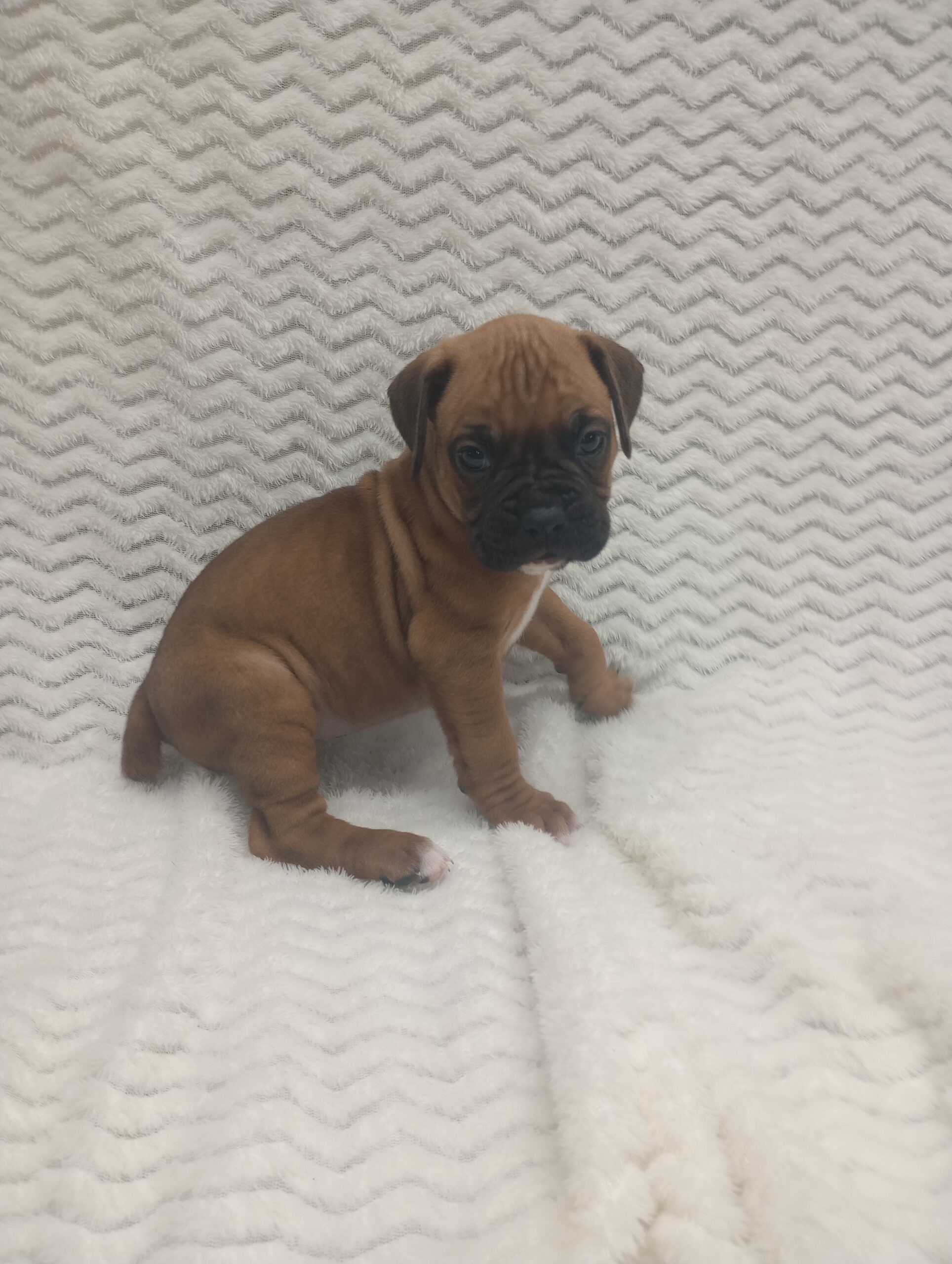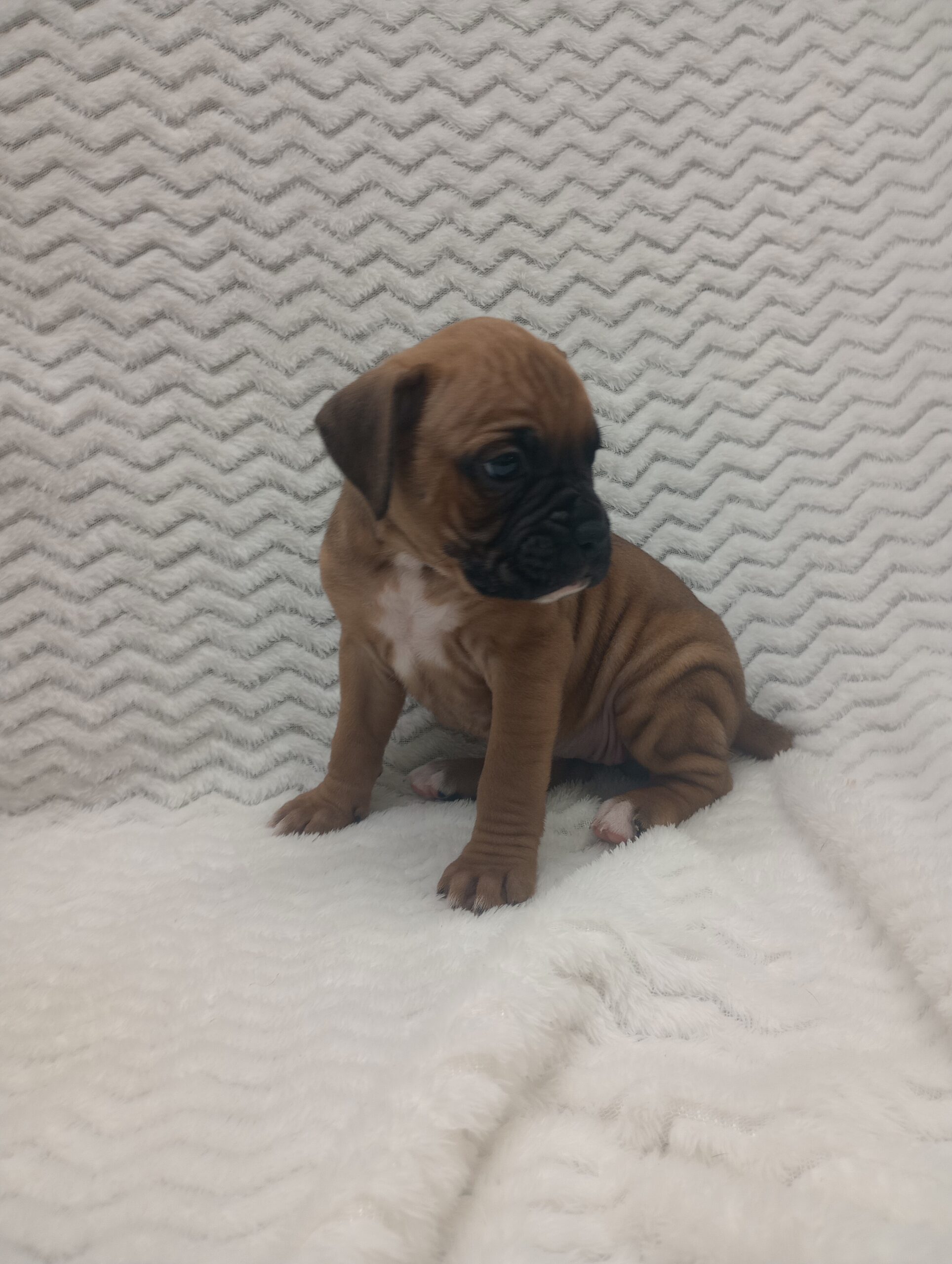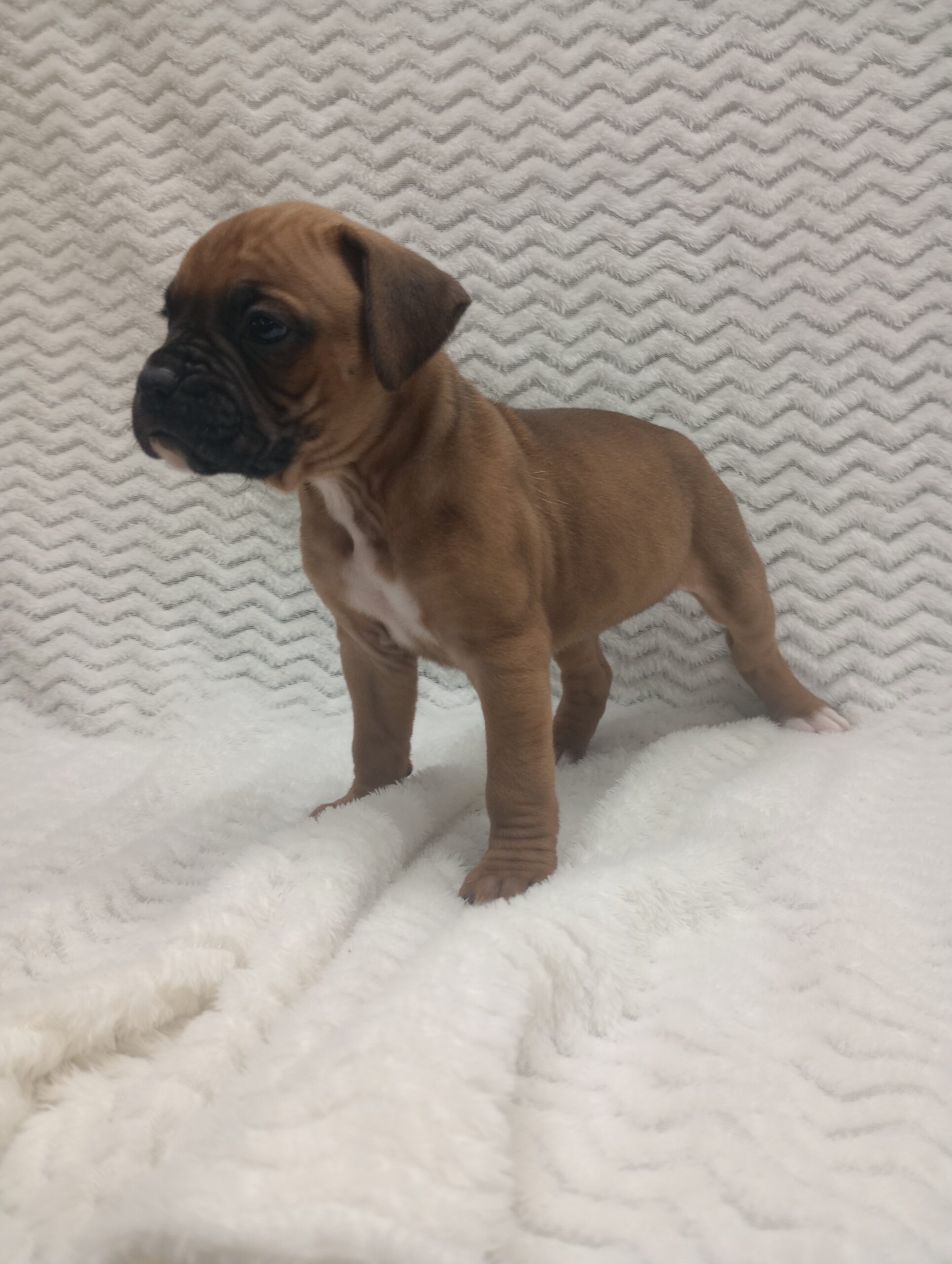 Everly is our boxer female she is super sweet and loveable. Her vaccines and dewormer are up-to-date. She is microchipped and will go home with a one year health guarantee.